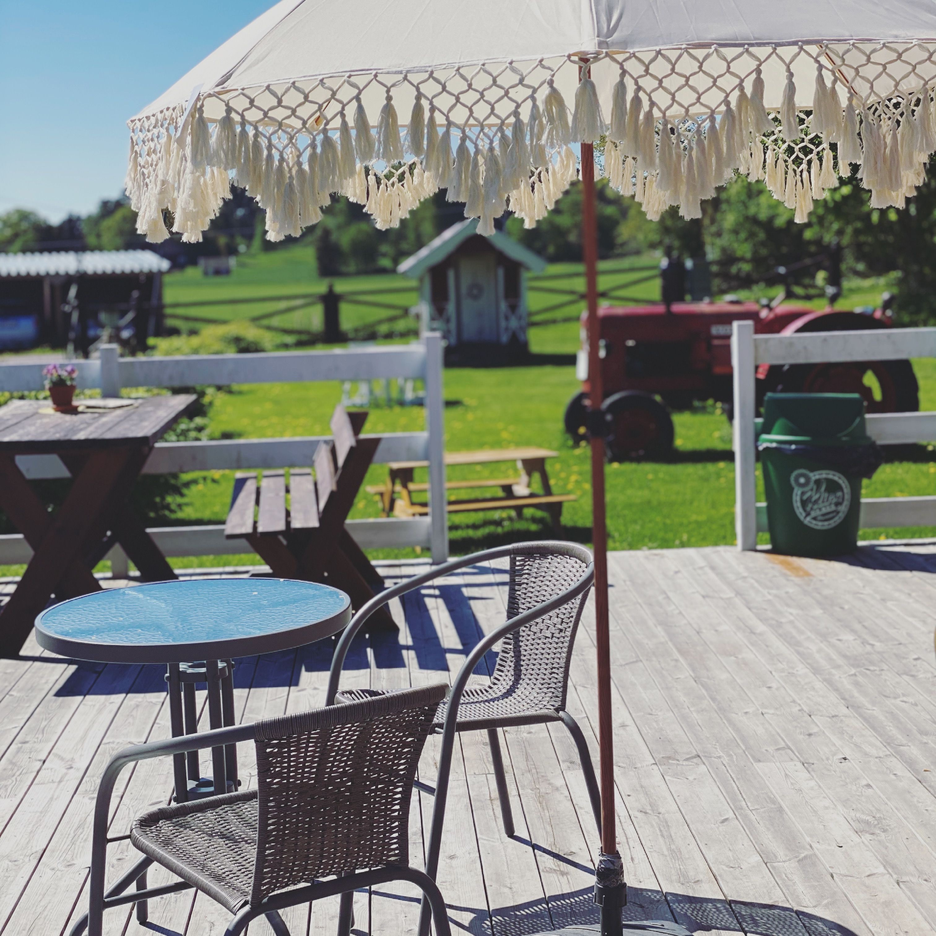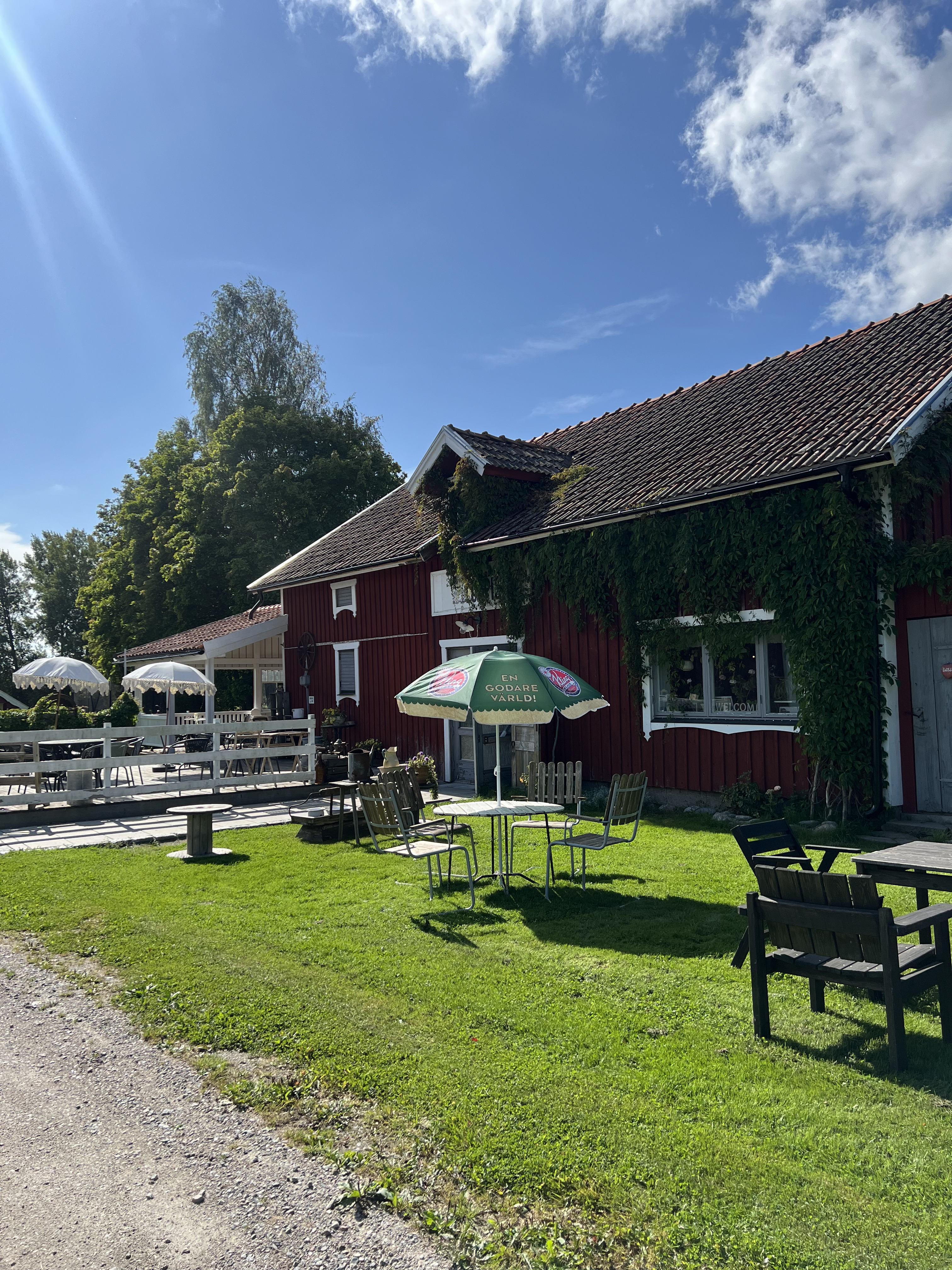 Café-delen ligger i logen och gofikat finns i butiken så ni får helt enkelt bära ut fikat dit. Och skulle det regna finns det låneparaplyn på båda sidor.